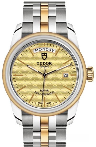 Часы Tudor Glamour Date Day представлены в корпусе из нержавеющей стали и желтого золота 18к размером 39 мм. Внутри корпуса установлен автоматический механизм, Калибр 2834, обладающий запасом хода 38 часов. На золотистом гильошированном циферблате отображаются часы, минуты, секунды, дата и день недели. Часы поставляются на браслете из нержавеющей стали и желтого золота 18к. Водонепроницаемость корпуса составляет 100 метров.