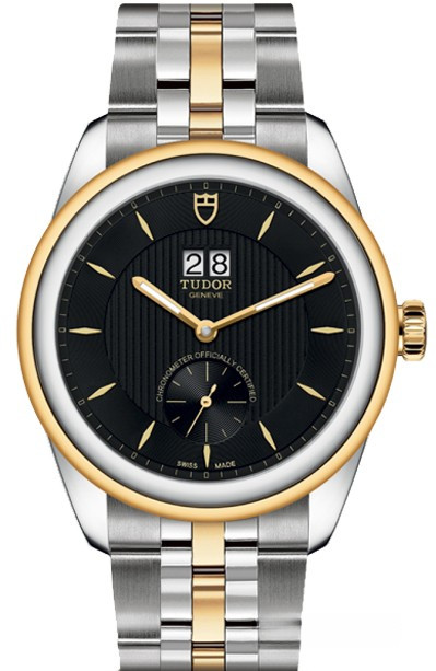 Часы Tudor Glamour Double Date представлены в корпусе из нержавеющей стали и желтого золота 18к размером 42 мм. Внутри корпуса установлен автоматический механизм, Калибр MT5641, обладающий запасом хода 70 часов. На черном гильошированном циферблате отображаются часы, минуты, секунды и дата. Часы поставляются на браслете из нержавеющей стали и желтого золота 18к. Водонепроницаемость корпуса составляет 100 метров. Часы имеют официальный сертификат хронометра COSC.