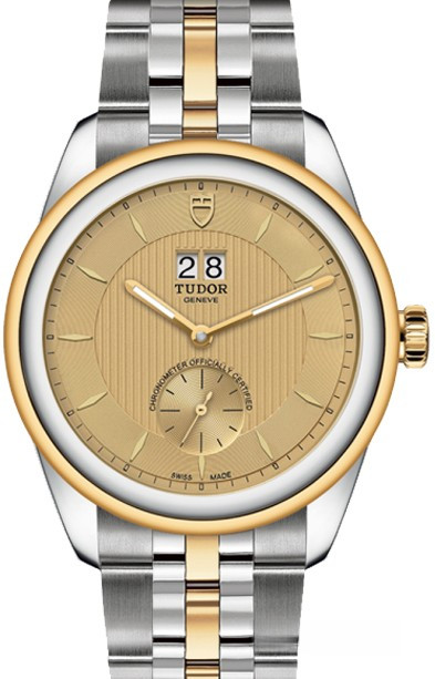 Часы Tudor Glamour Double Date представлены в корпусе из нержавеющей стали и желтого золота 18к размером 42 мм. Внутри корпуса установлен автоматический механизм, Калибр MT5641, обладающий запасом хода 70 часов. На золотистом гильошированном циферблате отображаются часы, минуты, секунды и дата. Часы поставляются на браслете из нержавеющей стали и желтого золота 18к. Водонепроницаемость корпуса составляет 100 метров. Часы имеют официальный сертификат хронометра COSC.