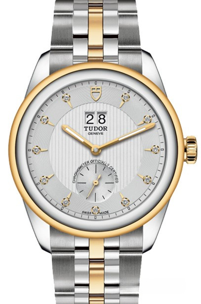 Часы Tudor Glamour Double Date представлены в корпусе из нержавеющей стали и желтого золота 18к размером 42 мм. Внутри корпуса установлен автоматический механизм, Калибр MT5641, обладающий запасом хода 70 часов. На серебристом гильошированном циферблате с 11-ю белыми бриллиантами отображаются часы, минуты, секунды и дата. Часы поставляются на браслете из нержавеющей стали и желтого золота 18к. Водонепроницаемость корпуса составляет 100 метров. Часы имеют официальный сертификат хронометра COSC.