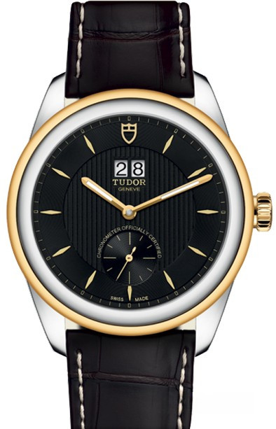 Часы Tudor Glamour Double Date представлены в корпусе из нержавеющей стали и желтого золота 18к размером 42 мм. Внутри корпуса установлен автоматический механизм, Калибр MT5641, обладающий запасом хода 70 часов. На черном гильошированном циферблате отображаются часы, минуты, секунды и дата. Часы поставляются на ремешке из кожи аллигатора с вставкой из нержавеющей стали. Водонепроницаемость корпуса составляет 100 метров. Часы имеют официальный сертификат хронометра COSC.
