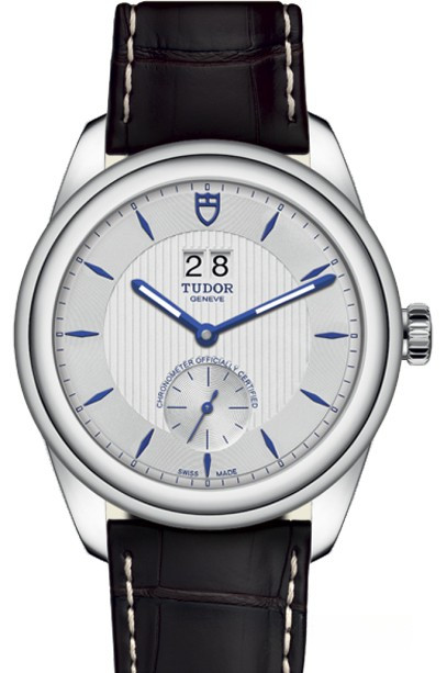 Часы Tudor Glamour Double Date представлены в корпусе из нержавеющей стали размером 42 мм. Внутри корпуса установлен автоматический механизм, Калибр MT5641, обладающий запасом хода 70 часов. На серебристом гильошированном циферблате отображаются часы, минуты, секунды и дата. Часы поставляются на ремешке из кожи аллигатора с вставкой из нержавеющей стали. Водонепроницаемость корпуса составляет 100 метров. Часы имеют официальный сертификат хронометра COSC.