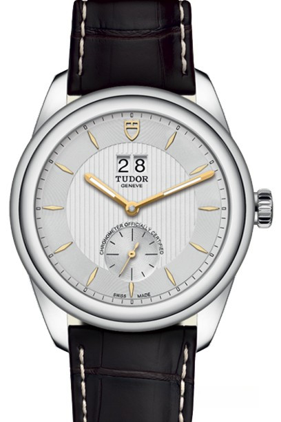 Часы Tudor Glamour Double Date представлены в корпусе из нержавеющей стали размером 42 мм. Внутри корпуса установлен автоматический механизм, Калибр MT5641, обладающий запасом хода 70 часов. На серебристом гильошированном циферблате отображаются часы, минуты, секунды и дата. Часы поставляются на ремешке из кожи аллигатора с вставкой из нержавеющей стали. Водонепроницаемость корпуса составляет 100 метров. Часы имеют официальный сертификат хронометра COSC.