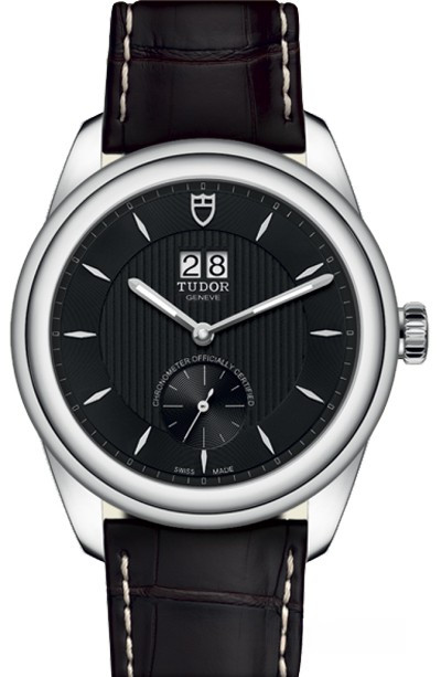 Часы Tudor Glamour Double Date представлены в корпусе из нержавеющей стали размером 42 мм. Внутри корпуса установлен автоматический механизм, Калибр MT5641, обладающий запасом хода 70 часов. На черном гильошированном циферблате отображаются часы, минуты, секунды и дата. Часы поставляются на ремешке из кожи аллигатора с вставкой из нержавеющей стали. Водонепроницаемость корпуса составляет 100 метров. Часы имеют официальный сертификат хронометра COSC.