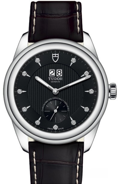 Часы Tudor Glamour Double Date представлены в корпусе из нержавеющей стали размером 42 мм. Внутри корпуса установлен автоматический механизм, Калибр MT5641, обладающий запасом хода 70 часов. На черном гильошированном циферблате с 11-ю белыми бриллиантами отображаются часы, минуты, секунды и дата. Часы поставляются на ремешке из кожи аллигатора с вставкой из нержавеющей стали. Водонепроницаемость корпуса составляет 100 метров. Часы имеют официальный сертификат хронометра COSC.