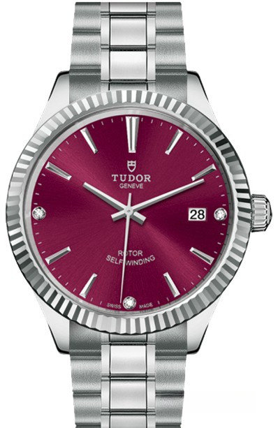 Часы Tudor Classic Style 38 выпущены в корпусе из нержавеющей стали размером 38 мм и водонепроницаемостью 100 м. Внутри корпуса установлен автоматический Калибр 2824 с запасом хода 38 часов. На бордовом циферблате с 3-мя белыми бриллиантами отображаются часы, минуты, секунды, дата. Часы комплектуются браслетом из нержавеющей стали.