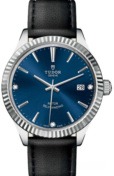 Часы Tudor Classic Style 38 выпущены в корпусе из нержавеющей стали размером 38 мм и водонепроницаемостью 100 м. Внутри корпуса установлен автоматический Калибр 2824 с запасом хода 38 часов. На синем циферблате с 3-мя белыми бриллиантами отображаются часы, минуты, секунды, дата. Часы комплектуются кожаным ремешком с вставкой из нержавеющей стали.