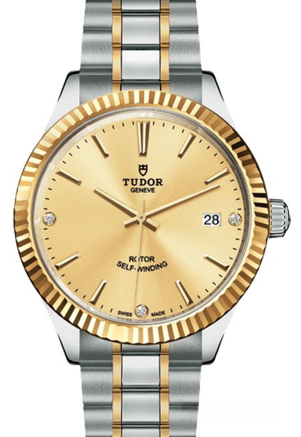 Часы Tudor Classic Style 38 выпущены в корпусе из нержавеющей стали и желтого золота 18к, размером 38 мм и водонепроницаемостью 100 м. Внутри корпуса установлен автоматический Калибр 2824 с запасом хода 38 часов. На золотистом циферблате с 3-мя белыми бриллиантами отображаются часы, минуты, секунды, дата. Часы комплектуются браслетом из нержавеющей стали и желтого золота 18к.
