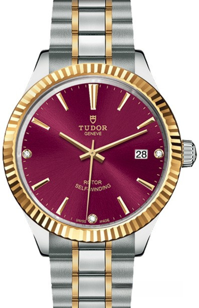Часы Tudor Classic Style 38 выпущены в корпусе из нержавеющей стали и желтого золота 18к, размером 38 мм и водонепроницаемостью 100 м. Внутри корпуса установлен автоматический Калибр 2824 с запасом хода 38 часов. На бордовом циферблате с 3-мя белыми бриллиантами отображаются часы, минуты, секунды, дата. Часы комплектуются браслетом из нержавеющей стали и желтого золота 18к.