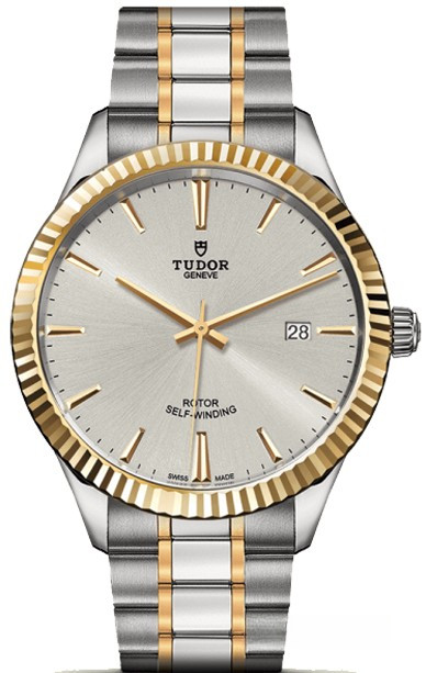 Часы Tudor Classic Style 41 выпущены в корпусе из нержавеющей стали и желтого золота 18к, размером 41 мм и водонепроницаемостью 100 м. Внутри корпуса установлен автоматический Калибр 2824 с запасом хода 38 часов. На серебристом циферблате отображаются часы, минуты, секунды, дата. Часы комплектуются браслетом из нержавеющей стали и желтого золота 18к.