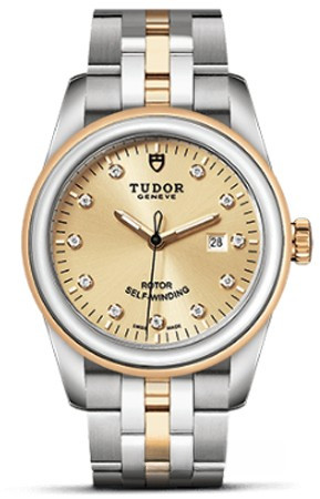Часы Tudor Glamour Date 31 mm выпущены в корпусе из нержавеющей стали и желтого золота 18к, размером 31 мм и водонепроницаемостью 100 м. Внутри корпуса установлен автоматический Калибр 2671 с запасом хода 38 часов. На золотистом циферблате с 10-ю белыми бриллиантами отображаются часы, минуты, секунды, дата. Часы комплектуются браслетом из нержавеющей стали желтого золота 18к.