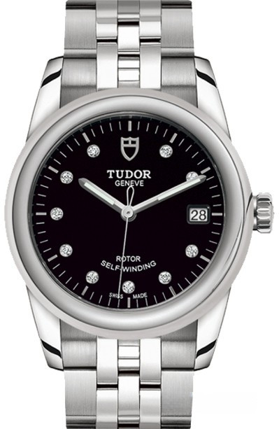 Часы Tudor Glamour Date 36 mm выпущены в корпусе из нержавеющей стали размером 36 мм и водонепроницаемостью 100 м. Внутри корпуса установлен автоматический Калибр 2824 с запасом хода 38 часов. На черном циферблате с 10-ю белыми бриллиантами отображаются часы, минуты, секунды, дата. Часы поставляются на браслете из нержавеющей стали.
