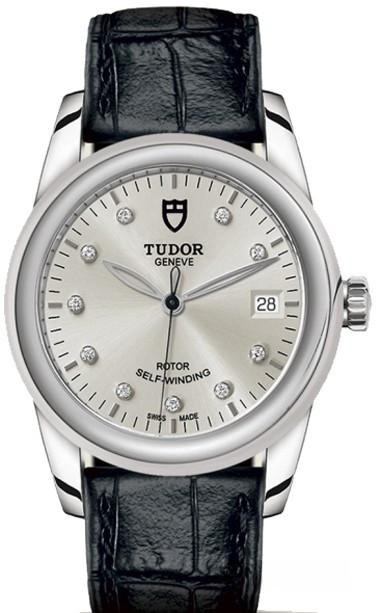 Часы Tudor Glamour Date 36 mm выпущены в корпусе из нержавеющей стали размером 36 мм и водонепроницаемостью 100 м. Внутри корпуса установлен автоматический Калибр 2824 с запасом хода 38 часов. На серебристом циферблате с 10-ю белыми бриллиантами отображаются часы, минуты, секунды, дата. Часы поставляются на ремешке из кожи аллигатора с вставкой из нержавеющей стали.