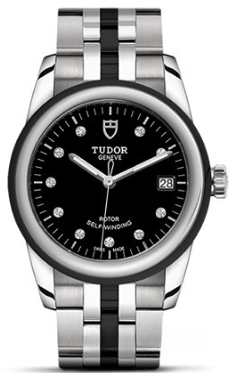 Часы Tudor Glamour Date 36 mm выпущены в корпусе из нержавеющей стали и керамики, размером 36 мм и водонепроницаемостью 100 м. Внутри корпуса установлен автоматический Калибр 2824 с запасом хода 38 часов. На черном циферблате с 10-ю белыми бриллиантами отображаются часы, минуты, секунды, дата. Часы комплектуются браслетом из нержавеющей стали и керамики.