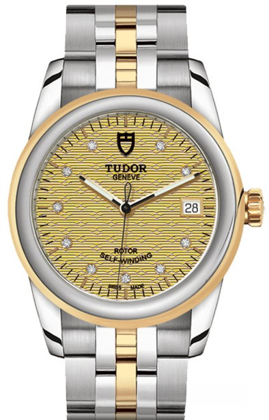 Часы Tudor Glamour Date 36 mm выпущены в корпусе из нержавеющей стали и желтого золота 18к размером 36 мм и водонепроницаемостью 100 м. Внутри корпуса установлен автоматический Калибр 2824 с запасом хода 38 часов. На золотистом гильошированном циферблате с 10-ю белыми бриллиантами отображаются часы, минуты, секунды, дата. Часы поставляются на браслете из нержавеющей стали и желтого золота 18к.