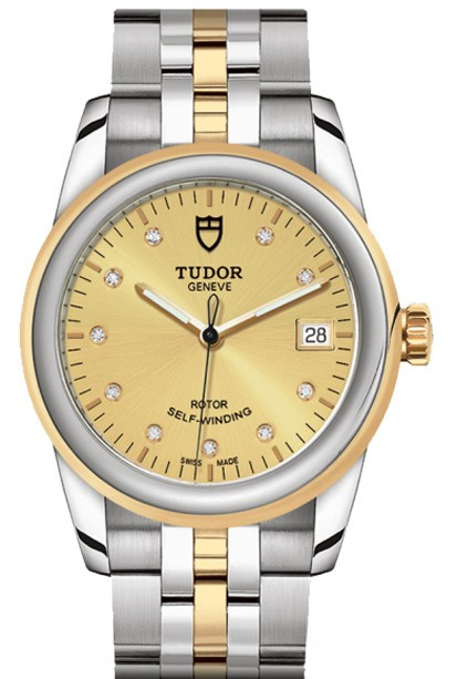 Часы Tudor Glamour Date 36 mm выпущены в корпусе из нержавеющей стали и желтого золота 18к размером 36 мм и водонепроницаемостью 100 м. Внутри корпуса установлен автоматический Калибр 2824 с запасом хода 38 часов. На золотистом циферблате с 10-ю белыми бриллиантами отображаются часы, минуты, секунды, дата. Часы поставляются на браслете из нержавеющей стали и желтого золота 18к.