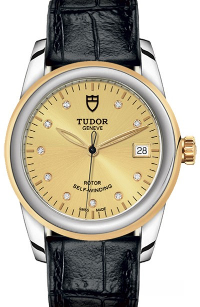 Часы Tudor Glamour Date 36 mm выпущены в корпусе из нержавеющей стали и желтого золота 18к размером 36 мм и водонепроницаемостью 100 м. Внутри корпуса установлен автоматический Калибр 2824 с запасом хода 38 часов. На золотистом циферблате с 10-ю белыми бриллиантами отображаются часы, минуты, секунды, дата. Часы поставляются на ремешке из кожи аллигатора с вставкой из нержавеющей стали.