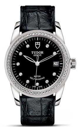Часы Tudor Glamour Date 36 mm выпущены в корпусе из нержавеющей стали, размером 36 мм и водонепроницаемостью 100 м. Внутри корпуса установлен автоматический Калибр 2824 с запасом хода 38 часов. На черном циферблате с 10-ю белыми бриллиантами отображаются часы, минуты, секунды, дата. Часы комплектуются ремешком из кожи аллигатора с вставкой из нержавеющей стали. Безель из белых бриллиантов.