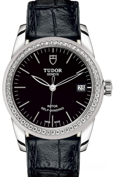 Часы Tudor Glamour Date 36 mm выпущены в корпусе из нержавеющей стали размером 36 мм и водонепроницаемостью 100 м. Внутри корпуса установлен автоматический Калибр 2824 с запасом хода 38 часов. На черном циферблате отображаются часы, минуты, секунды, дата. Часы поставляются на ремешке из кожи аллигатора с вставкой из нержавеющей стали. Безель из белых бриллиантов.