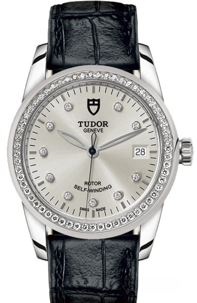 Часы Tudor Glamour Date 36 mm выпущены в корпусе из нержавеющей стали размером 36 мм и водонепроницаемостью 100 м. Внутри корпуса установлен автоматический Калибр 2824 с запасом хода 38 часов. На серебристом циферблате с 10-ю белыми бриллиантами отображаются часы, минуты, секунды, дата. Часы поставляются на ремешке из кожи аллигатора с вставкой из нержавеющей стали. Безель из белых бриллиантов.