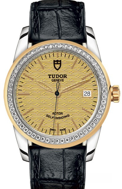 Часы Tudor Glamour Date 36 mm выпущены в корпусе из нержавеющей стали и желтого золота 18к размером 36 мм и водонепроницаемостью 100 м. Внутри корпуса установлен автоматический Калибр 2824 с запасом хода 38 часов. На золотистом гильошированном циферблате отображаются часы, минуты, секунды, дата. Часы поставляются на ремешке из кожи аллигатора с вставкой из нержавеющей стали. Безель из белых бриллиантов.