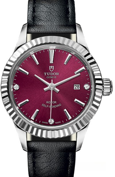 Часы Tudor Classic Style 28 выпущены в корпусе из нержавеющей стали размером 28 мм и водонепроницаемостью 100 м. Внутри корпуса установлен автоматический Калибр 2671 с запасом хода 38 часов. На бордовом циферблате с 3-мя белыми бриллиантами отображаются часы, минуты, секунды, дата. Часы комплектуются кожаным ремешком с вставкой из нержавеющей стали.