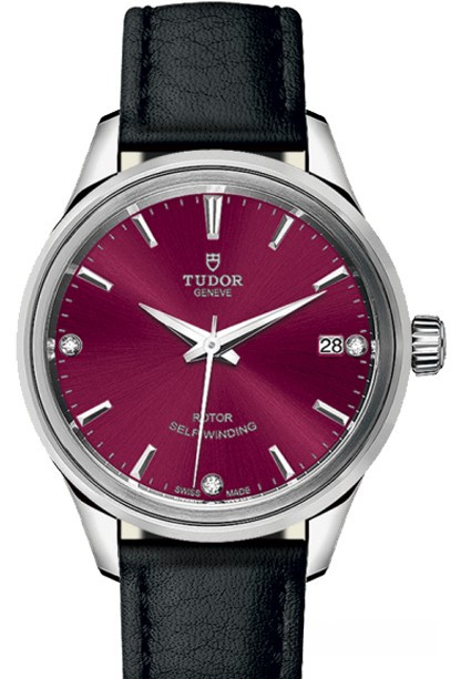 Часы Tudor Classic Style 34 выпущены в корпусе из нержавеющей стали размером 34 мм и водонепроницаемостью 100 м. Внутри корпуса установлен автоматический Калибр 2824 с запасом хода 38 часов. На бордовом циферблате с 3-мя белыми бриллиантами отображаются часы, минуты, секунды, дата. Часы комплектуются кожаным ремешком с вставкой из нержавеющей стали.