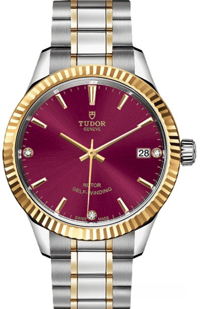 Часы Tudor Classic Style 34 выпущены в корпусе из нержавеющей стали и желтого золота 18к, размером 34 мм и водонепроницаемостью 100 м. Внутри корпуса установлен автоматический Калибр 2824 с запасом хода 38 часов. На бордовом циферблате с 3-мя белыми бриллиантами отображаются часы, минуты, секунды, дата. Часы комплектуются браслетом из нержавеющей стали и желтого золота 18к.