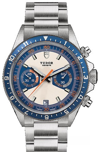 Часы Tudor Chrono выпущены в корпусе из нержавеющей стали, размером 42 мм и водонепроницаемостью 150 м. Внутри корпуса установлен автоматический Калибр 2892 с запасом хода 42 часа. На синем с белым циферблате отображаются часы, минуты, секунды, дата, регистры хронографа. Часы комплектуются браслетом из нержавеющей стали. Двунаправленно вращающийся безель показывает время второго часового пояса.