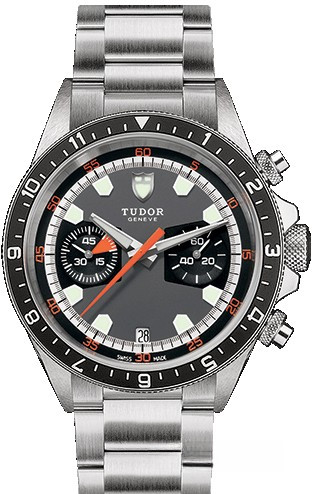 Часы Tudor Chrono выпущены в корпусе из нержавеющей стали, размером 42 мм и водонепроницаемостью 150 м. Внутри корпуса установлен автоматический Калибр 2892 с запасом хода 42 часа. На сером с черным циферблате отображаются часы, минуты, секунды, дата, регистры хронографа. Часы комплектуются браслетом из нержавеющей стали. Двунаправленно вращающийся безель показывает время второго часового пояса.