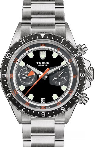 Часы Tudor Chrono выпущены в корпусе из нержавеющей стали, размером 42 мм и водонепроницаемостью 150 м. Внутри корпуса установлен автоматический Калибр 2892 с запасом хода 42 часа. На черном с серым циферблате отображаются часы, минуты, секунды, дата, регистры хронографа. Часы комплектуются браслетом из нержавеющей стали. Двунаправленно вращающийся безель показывает время второго часового пояса.
