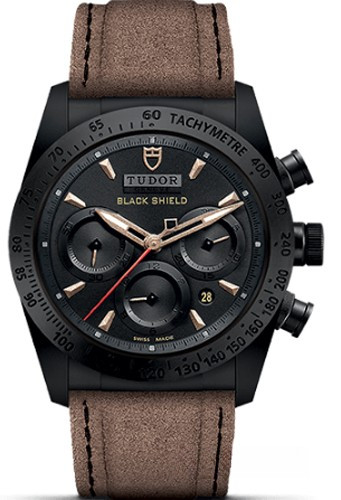 Часы Tudor Fastrider Black Shield выпущены в корпусе из керамики, размером 42 мм и водонепроницаемостью 150 м. Внутри корпуса установлен автоматический Калибр 7753 с запасом хода 46 часов. На черном циферблате отображаются часы, минуты, секунды, дата, тахиметр. Часы комплектуются кожаным ремешком с вставкой из нержавеющей стали.