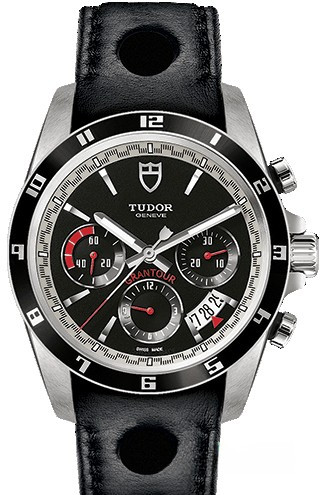 Часы Tudor Grantour выпущены в корпусе из нержавеющей стали, размером 42 мм и водонепроницаемостью 150 м. Внутри корпуса установлен автоматический Калибр 7753 с запасом хода 46 часов. На черном циферблате отображаются часы, минуты, секунды, дата, накопители хронографа. Часы комплектуются кожаным ремешом с вставкой из нержавеющей стали.