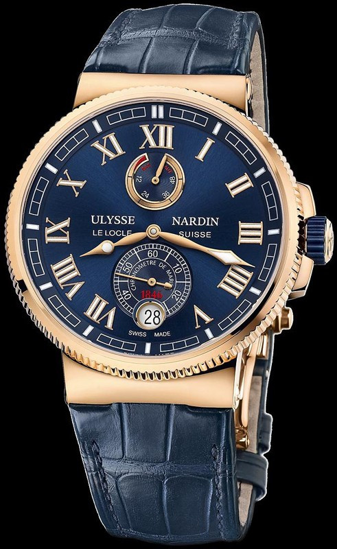 Часы Ulysse Nardin Marine Chronometer Manufacture выполнены в стиле классического морского хронометра. Модель имеет круглый корпус из розового золота 18к, диаметром 43 мм, водонепроницаемый до 100 метров. Защищенная завинчивающаяся заводная головка, с эмблемой бренда на ее торце. Боковая стенка корпуса с мелким рифлением. Сапфировое стекло с антибликовым покрытием защищает синий циферблат с золотыми римскими цифрами, часовой и минутной стрелками с люминесцентным покрытием. Модель оснащена мануфактурным швейцарским автоматическим механизмом Ulysse Nardin UN 118, на 50 камнях, с 60-часовым запасом хода, функциями индикации часов, минут (посредством соответствующих центральных стрелок), секунд (на малом боковом циферблате на 6 часах), даты (в круглой апертуре на 6 часах), а также, запаса хода (стрелочный указатель на 12 часах). Калибр имеет запатентованный алмазно-кремниевый (DiamonSIL) спуск и кремниевую балансовую пружину. Поставляется на ремешке из кожи аллигатора с вставкой из розового золота 18к.