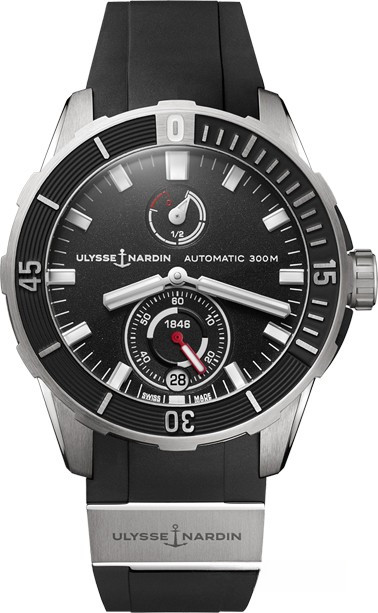 Часы Ulysse Nardin Diver Chronometer представлены в корпусе из титана размером 44 мм и водонепроницаемостью до 300 метров. Внутри корпуса установлен автоматический механизм с запасом хода 48 часов. На черном циферблате отображаются часы, минуты, секунды, дата, запас хода. Часы комплектуются каучуковым ремешком с вставкой из титана.