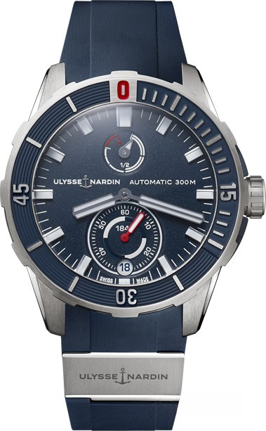 Часы Ulysse Nardin Diver Chronometer представлены в корпусе из титана размером 44 мм и водонепроницаемостью до 300 метров. Внутри корпуса установлен автоматический механизм с запасом хода 48 часов. На синем циферблате отображаются часы, минуты, секунды, дата, запас хода. Часы комплектуются каучуковым ремешком с вставкой из титана.