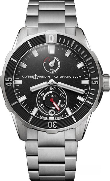 Часы Ulysse Nardin Diver Chronometer представлены в корпусе из титана размером 44 мм и водонепроницаемостью до 300 метров. Внутри корпуса установлен автоматический механизм с запасом хода 48 часов. На черном циферблате отображаются часы, минуты, секунды, дата, запас хода. Часы комплектуются браслетом из нержавеющей стали.