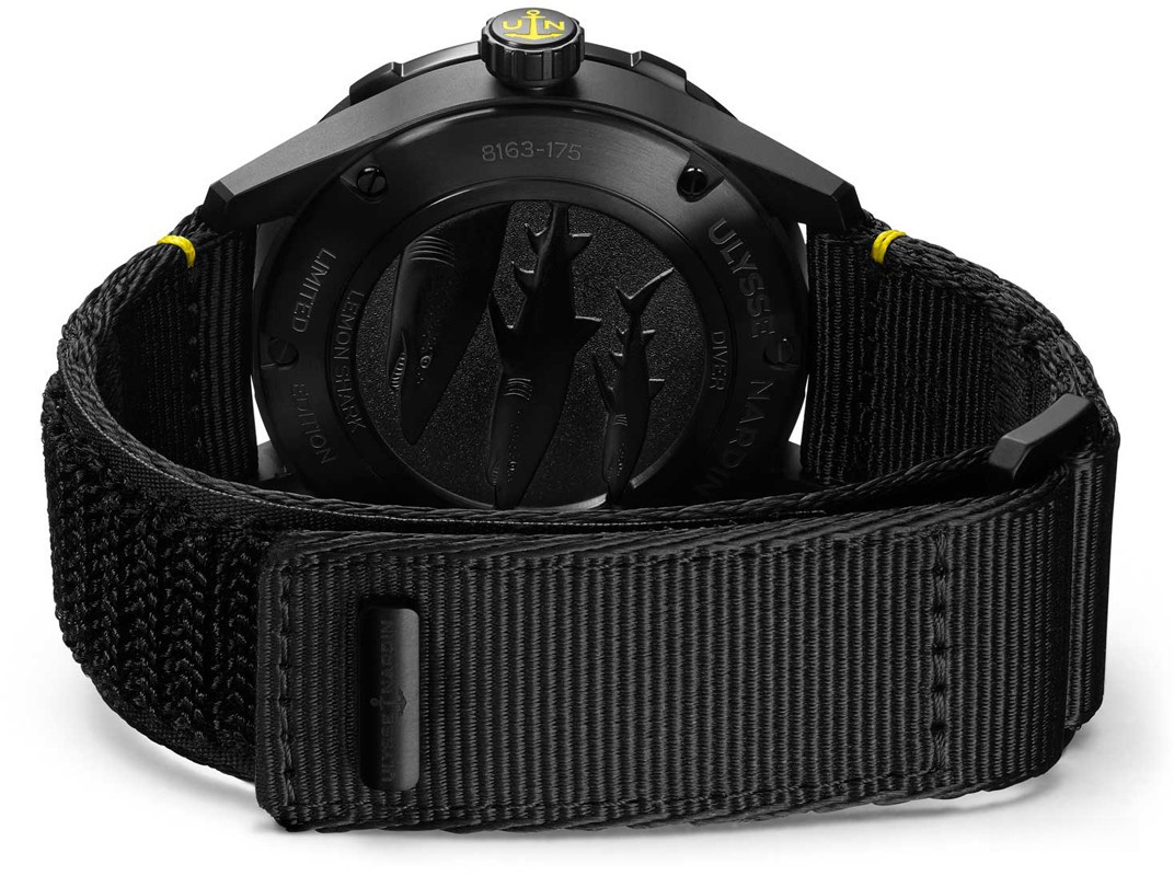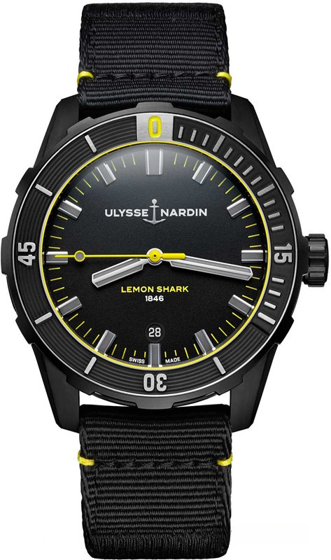 Часы Ulysse Nardin Diver Lemon Shark представлены в корпусе из нержавеющей стали с покрытием DLC размером 42 мм водонепроницаемостью 300 метров. Внутри корпуса находится автоматический механизм, Калибр UN-816, обладающий запасом хода 42 часа. На черном циферблате отображаются часы, минуты, секунды, дата. Часы поставляются на текстильном ремешке с вставкой из нержавеющей стали. Серия ограничена - 300 шт.
