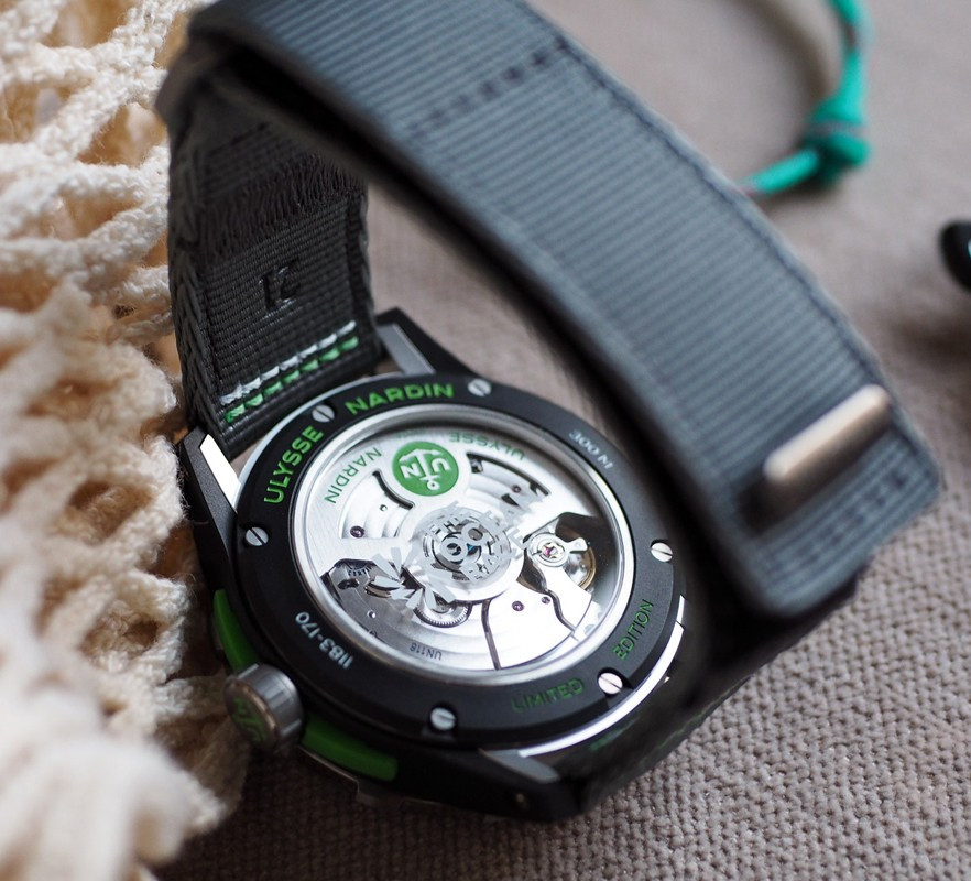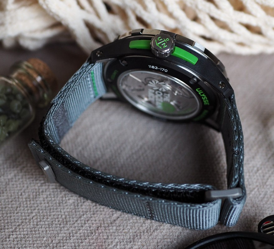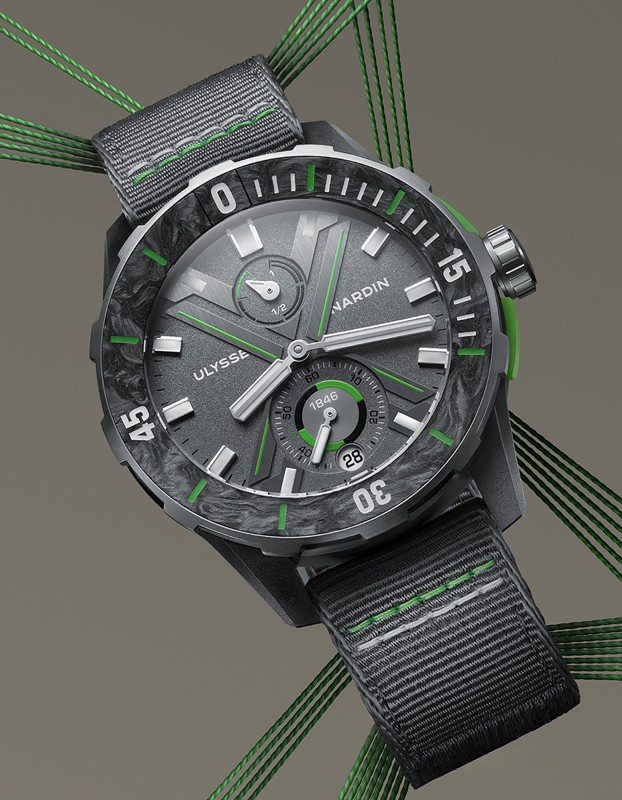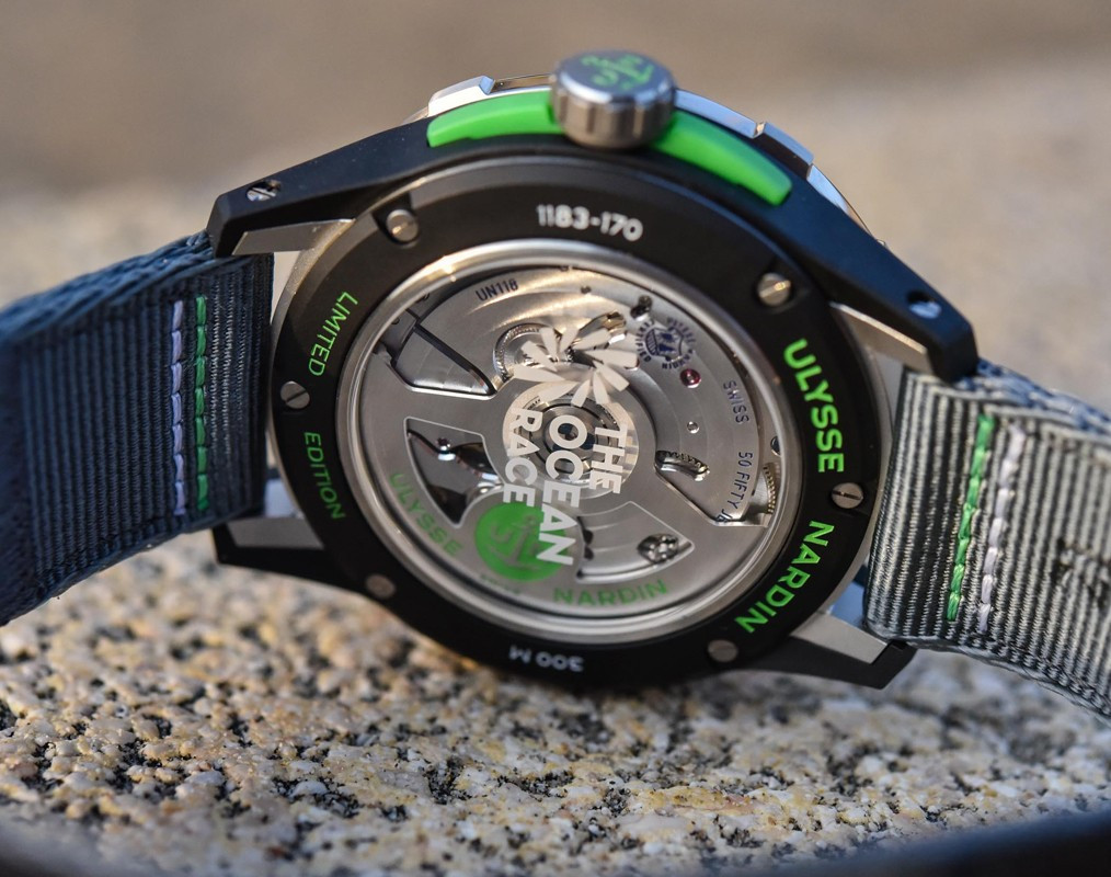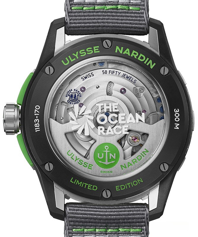 Часы Ulysse Nardin Diver Ocean Race представлены в корпусе из нержавеющей стали и карбона размером 44 мм водонепроницаемостью 300 метров. Внутри корпуса установлен автоматический механизм, Калибр UN-118, обладающий запасом хода 60 часов. На сером циферблате отображаются часы, минуты, секунды, дата, запас хода. Часы комплектуются текстильным ремешком с застежкой из нержавеющей стали. Серия ограничена - 200 шт.