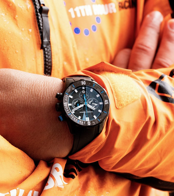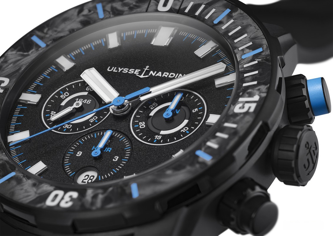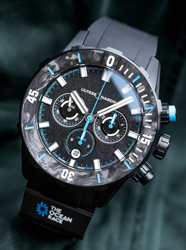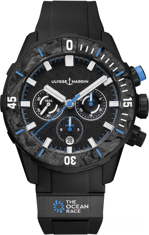 Часы Ulysse Nardin Ocean Race Diver Chronograph представлены в корпусе размером 44 мм из титана с покрытием DLC водонепроницаемостью 300 метров. Внутри корпуса установлен автоматический механизм, Калибр UN-150, обладающий запасом хода 48 часов. На черном циферблате отображаются часы, минуты, секунды, дата. Часы поставляются на каучуковом ремешке с титановой застежкой. Серия ограничена - 100 шт.