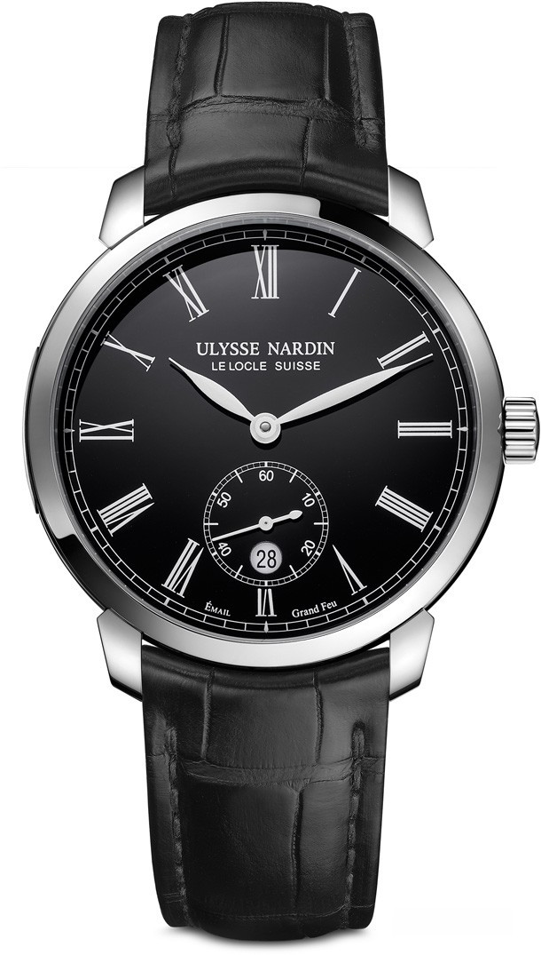 Ulysse Nardin представили классическую модель Classico Manufacture Grand Feu с великолепным черным циферблатом. Корпус новинки круглой формы, изготовлен из нержавеющей стали. Размер корпуса составляет 40 х 9.6 мм, водонепроницаемость до 30 метров. С обеих сторон корпуса установлено сапфировое стекло. Циферблат изготовлен в технике эмали Grand Feu, не его фоне размещены белые накладные римские цифры. Листовидные стрелки часов и минут находятся в центре циферблата, на 6-ти часах расположился индикатор даты и маленькой секундной стрелки. Центральные стрелки покрыты SuperLuminova. Часы комплектуются мануфактурным Калибром Ulysse Nardin UN320 с автоматическим заводом и запасом хода 48 часов. Новинка комплектуется черным ремешком из кожи аллигатора с застежкой из нержавеющей стали.