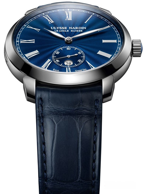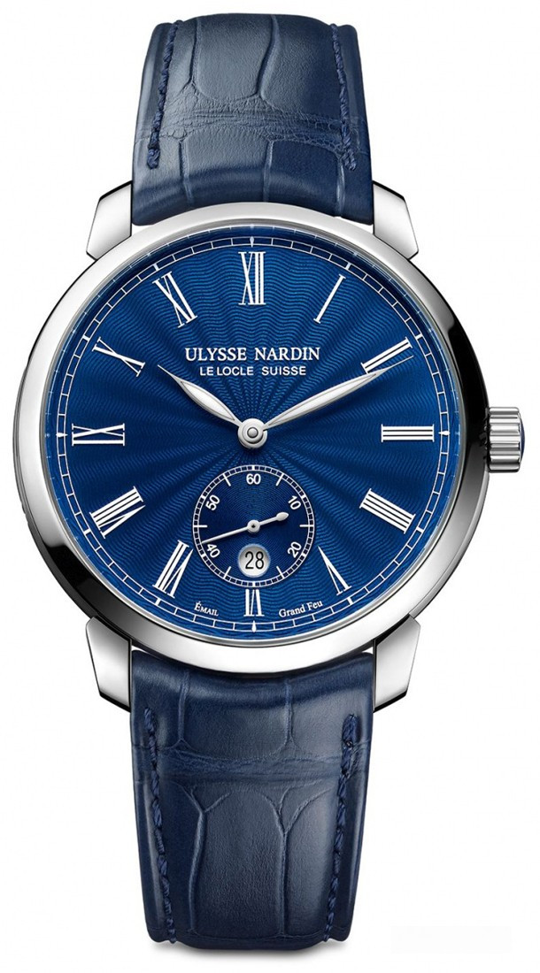 Ulysse Nardin представили классическую модель Classico Manufacture Blue Grand Feu с великолепным синим гильошированным циферблатом.Корпус новинки круглой формы, изготовлен из нержавеющей стали. Размер корпуса составляет 40 х 9.6 мм, водонепроницаемость до 30 метров. С обеих сторон корпуса установлено сапфировое стекло. Циферблат изготовлен в технике эмали Grand Feu, не его фоне размещены белые накладные римские цифры. Листовидные стрелки часов и минут находятся в центре циферблата, на 6-ти часах расположился индикатор даты и маленькой секундной стрелки. Центральные стрелки покрыты SuperLuminova. Часы комплектуются мануфактурным Калибром Ulysse Nardin UN320 с автоматическим заводом и запасом хода 48 часов. Новинка комплектуется синим ремешком из кожи аллигатора с застежкой из нержавеющей стали.