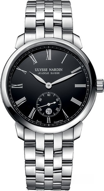 Ulysse Nardin представили классическую модель Classico Manufacture Grand Feu с великолепным черным циферблатом. Корпус новинки круглой формы, изготовлен из нержавеющей стали. Размер корпуса составляет 40 х 9.6 мм, водонепроницаемость до 30 метров. С обеих сторон корпуса установлено сапфировое стекло. Циферблат изготовлен в технике эмали Grand Feu, на его фоне размещены серебристые накладные римские цифры. Листовидные стрелки часов и минут находятся в центре циферблата, на 6-ти часах расположился индикатор даты и маленькой секундной стрелки. Центральные стрелки покрыты SuperLuminova. Часы комплектуются мануфактурным Калибром Ulysse Nardin UN-320 с автоматическим заводом и запасом хода 48 часов. Новинка комплектуется браслетом из нержавеющей стали.