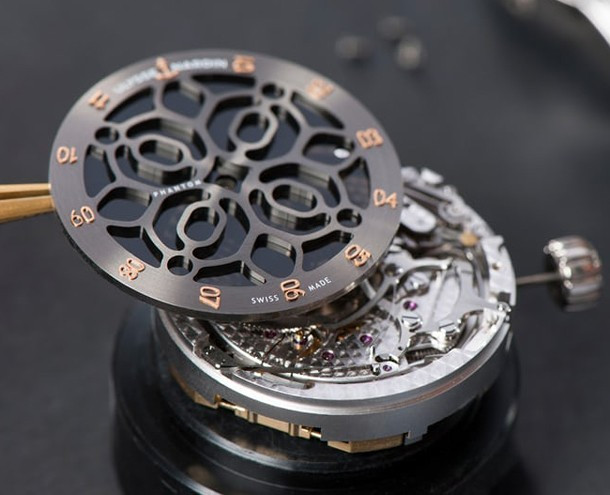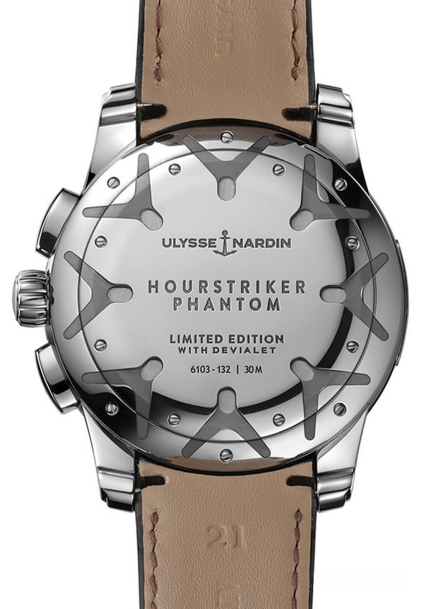 Часы Ulysse Nardin Hourstriker Phantom представлены в титановом корпусе диаметром 43 мм водонепроницаемостью 30 м. Внутри корпуса установлен автоматический механизм с репетиром, Калибр UN-610, обладающий запасом хода 42 часа. На черном циферблате отображаются часы и минуты. Часы поставляются на ремешке из кожи аллигатора с титановой вставкой. Серия ограничена - 85 шт.