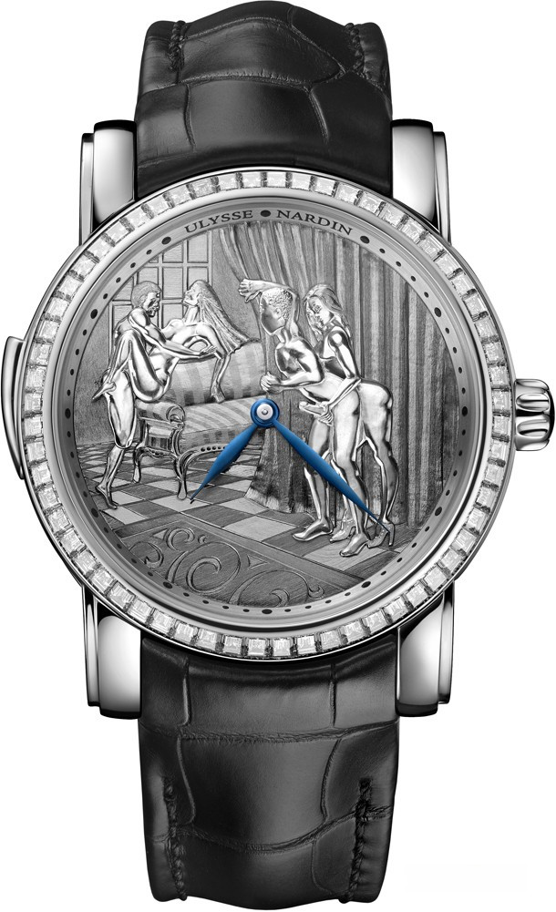 С момента своего создания в далеком 1846 году, мануфактура Ulysse Nardin является одним из признанных мастеров высокого часового искусства, в частотности, в области создания сложных механизмов с боем. Минутные репетиры с движущимися фигурками на циферблате - «жакемарами» отбивают часы, четверти и минуты. В модели Classic Voyeur механизм боя активируется как при наступлении каждого часа, так и при нажатии кнопки «по запросу». Жакемары модели Classic Voyeur являются свидетелями и участниками пикантной сцены, умело разыгранной на циферблате цвета антрацит. Уникальная, восхитительно бесстыжая модель Classic Voyeur – жакемары на циферблате которой выполнены из платины 950. Бой в двух тональностях. Корпус диаметром 42 мм. Только 18 экземпляров в коллекции. Модель из платины украшена 60 мерцающими бриллиантами огранки багет общим весом 3,5 карата.