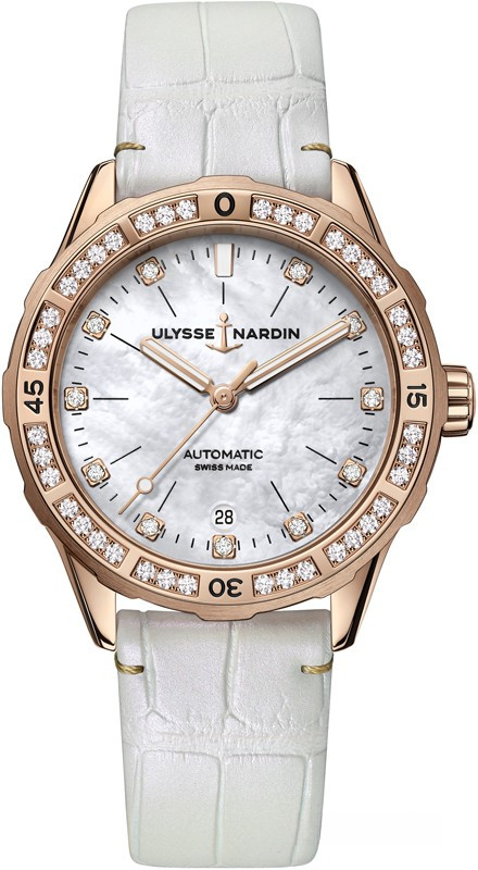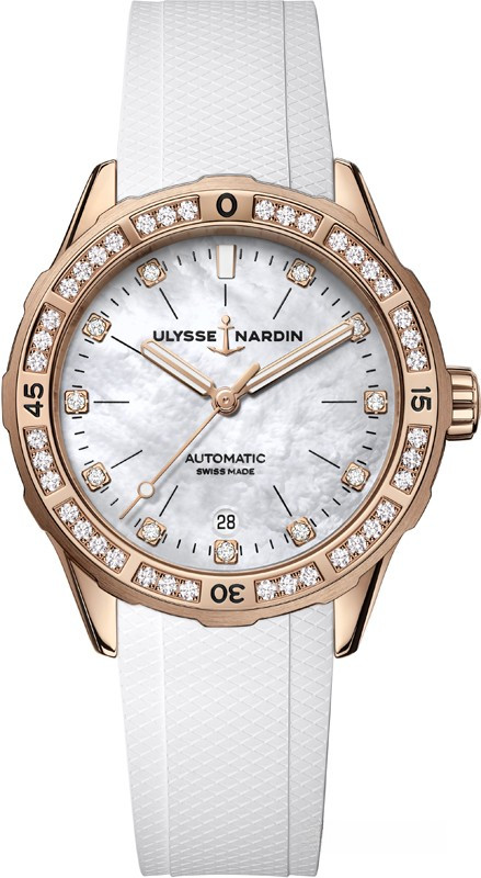 Часы Ulysse Nardin Lady Diver 39 mm представлены в корпусе из розового золота 18к размером 39 мм и водонепроницаемостью до 300 метров. Внутри корпуса установлен автоматический механизм, Калибр UN-816 с запасом хода 42 часа. На белом жемчужном циферблате с 11-ю белыми бриллиантами отображаются часы, минуты, секунды, дата. Часы комплектуются ремешком из каучука с золотой застежкой. Безель из белых бриллиантов.