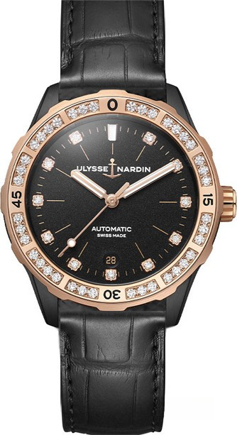 Часы Ulysse Nardin Lady Diver 39 mm представлены в корпусе из нержавеющей стали с покрытием PVD и розового золота 18к размером 39 мм и водонепроницаемостью до 300 метров. Внутри корпуса установлен автоматический механизм, Калибр UN-816 с запасом хода 42 часа. На черном циферблате с 11-ю белыми бриллиантами отображаются часы, минуты, секунды, дата. Часы комплектуются ремешком из кожи аллигатора с вставкой из нержавеющей стали. Безель из белых бриллиантов.