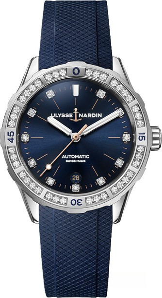 Часы Ulysse Nardin Lady Diver 39 mm представлены в корпусе из нержавеющей стали размером 39 мм и водонепроницаемостью до 300 метров. Внутри корпуса установлен автоматический механизм, Калибр UN-816 с запасом хода 42 часа. На синем циферблате с 11-ю белыми бриллиантами отображаются часы, минуты, секунды, дата. Часы комплектуются каучуковым ремешком с вставкой из нержавеющей стали. Безель из белых бриллиантов.