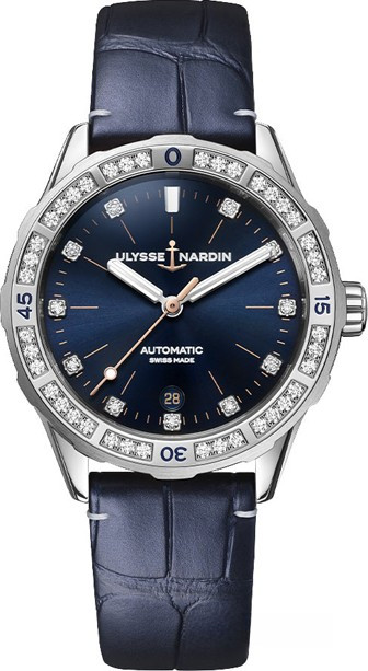 Часы Ulysse Nardin Lady Diver 39 mm представлены в корпусе из нержавеющей стали размером 39 мм и водонепроницаемостью до 300 метров. Внутри корпуса установлен автоматический механизм, Калибр UN-816 с запасом хода 42 часа. На синем циферблате с 11-ю белыми бриллиантами отображаются часы, минуты, секунды, дата. Часы комплектуются ремешком из кожи аллигатора с вставкой из нержавеющей стали. Безель из белых бриллиантов.