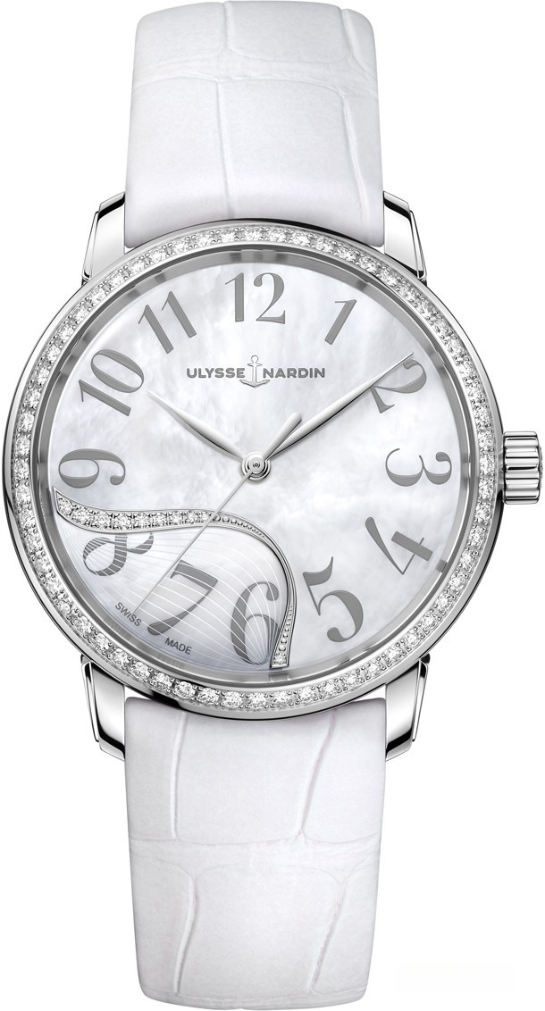Часы Ulysse Nardin Jade выпущены в корпусе из нержавеющей стали, размером 37 мм и водонепроницаемостью 30 м. Внутри корпуса установлен автоматический механизм UN - 815. На белом жемчужном циферблате с отображаются часы, минуты, секунды. Запас хода 42 часа. Часы комплектуются ремешком из кожи аллигатора с вставкой из нержавеющей стали. Безель из белых бриллиантов.